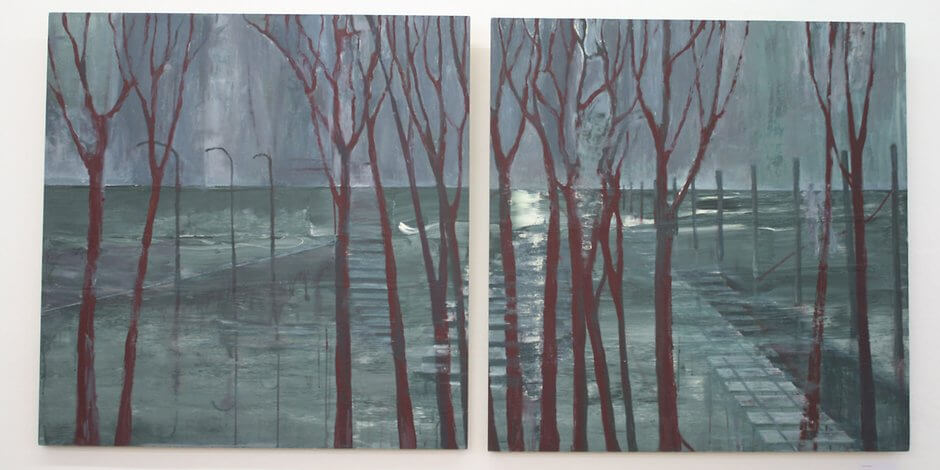 Diese Befreiung kann auch Zusammenbruch bedeuten, so dass das Ich sich verliert und, wie in den zeichnerisch-fikrigen Bewegungen von Michaela Heiker, nurmehr vage Spuren übrig bleiben. In einer komplexen Komposition führt Renate Geiter das vertrackte und geheimnisvolle Verhältnis von bewussten und unbewussten Anteilen in unserem seelischen Geschehen vor Augen. Stege und Eisenbahnschienen führen in eine unbekannte Tiefe und enden im Meer der Unendlichkeit. Die Baumgerippe im Vordergrund bringen den Hauch von Unheimlichkeit und Tod in die Szenerie. Klein und versteckt erscheinen darin die vagen Körperschemen zweier Liebender zwischen sinnlicher Verführung, Nähe-Verlangen und Illusion. Poesie und diffuse Farbverwischungen, Trauer und Melancholie, Verwirrung und Einsamkeit bestimmen diese Szenerie.