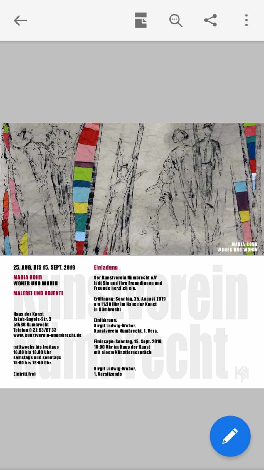 Von Maria Rohr Ausstellung With 0 KommentareDer Kunstverein Nümbrecht zeigt, beginnend mit einer Vernissage am Sonntag, dem 25. August um 11:30 Uhr bis zur Finissage am Sonntag, dem 15. September 16 Uhr, im Haus der Kunst in Nümbrecht Malerei und Objekte von Maria Rohr.