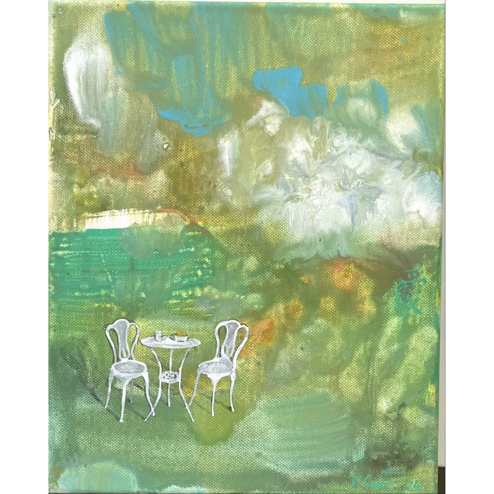 Seit diesem Jahr lasse ich dem Zufall einen großen Raum. Der Hintergrund entsteht, ohne wollen, ohne streben nach Profit oder im mushotoku, wie es ein weiser Anspruch im Zen-Buddhismuss ist. Aber so Weise bin ich dann doch nicht in letzter Konsequenz. Denn ich möchte dem Entstandenen einer Bestimmung zuführen ud so deffiniere ich den Raum mittels Gegenständen verschiedener Art. Das japanische Kanji auf dem Bild heißt Liebe.