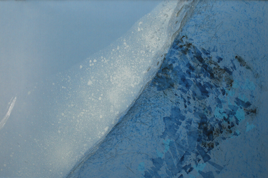 Mischtechnik auf blauem Transparentpapier, beidseitig beschichtet. Eis, vereiste Kanten, ein close-up oder ein Bergrücken - besonders reizvoll, wenn Licht durch das Transparentpapier fällt und das Motiv zum Leuchten bringt.