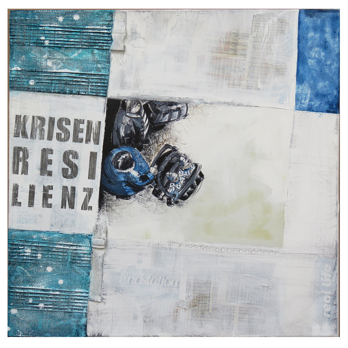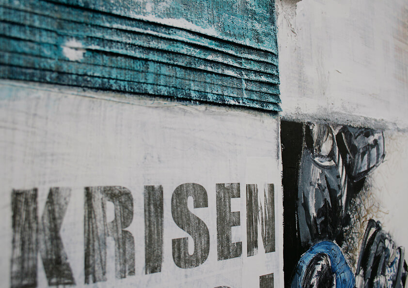 Typografische Elemente und eine Gruppe mobiler Menschen prägen die grau-weiße Fläche, auf faltig collagiertem Untergrund.