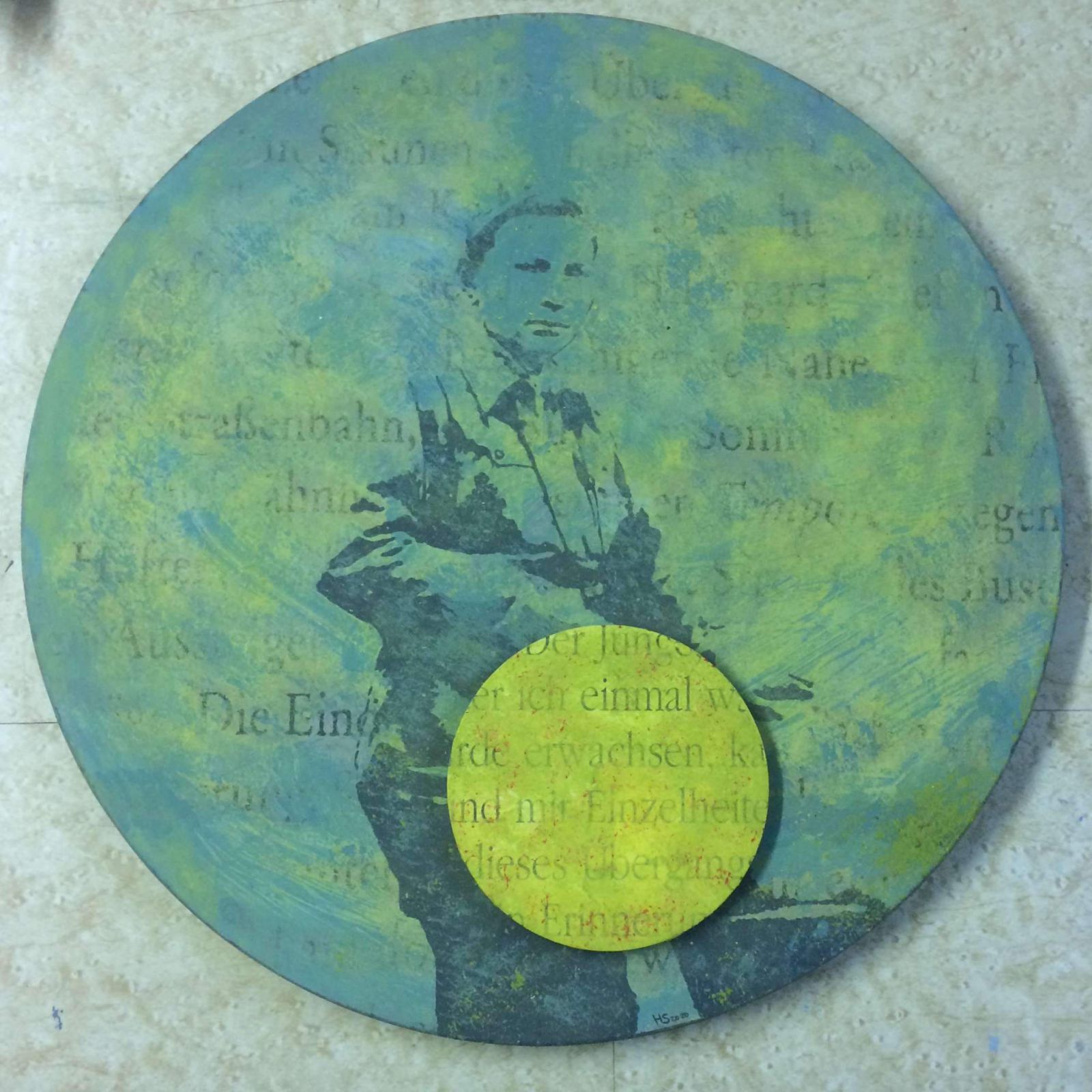 2020, rund 50 cm, Acrylfarben-Mischtechnik auf Holzplatte, Textfragmente aus „Der Freund und der Fremde“ von Uwe Timm, Bild nach Jugendfoto von Uwe Timm