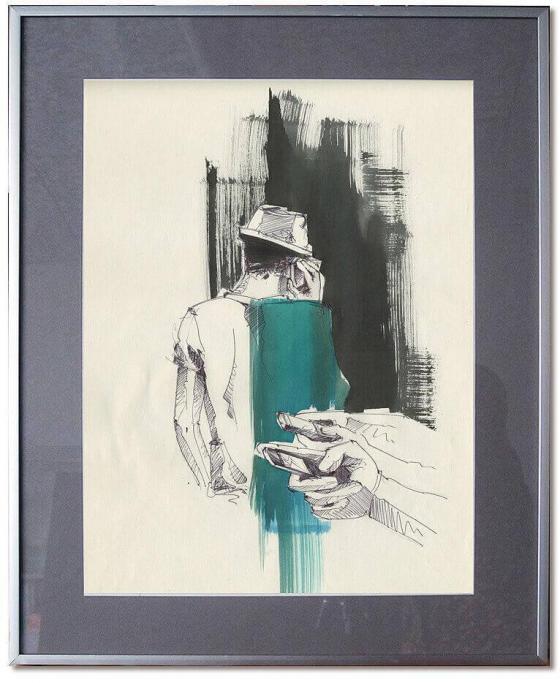 Tuschezeichnung DIN A3 in Metall-Wechselrahmen 41 x 51 cm. Zeichnung Mensch + mobile Kommunikation mit farbiger Tusche ergänzt, auf warmweißem Papier.