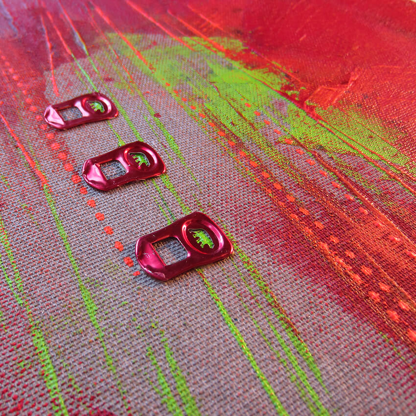 Collage und Acryl auf Leinwand, Format 40x40 cm. Integrierte Metallschließen von 3 Getränkedosen.