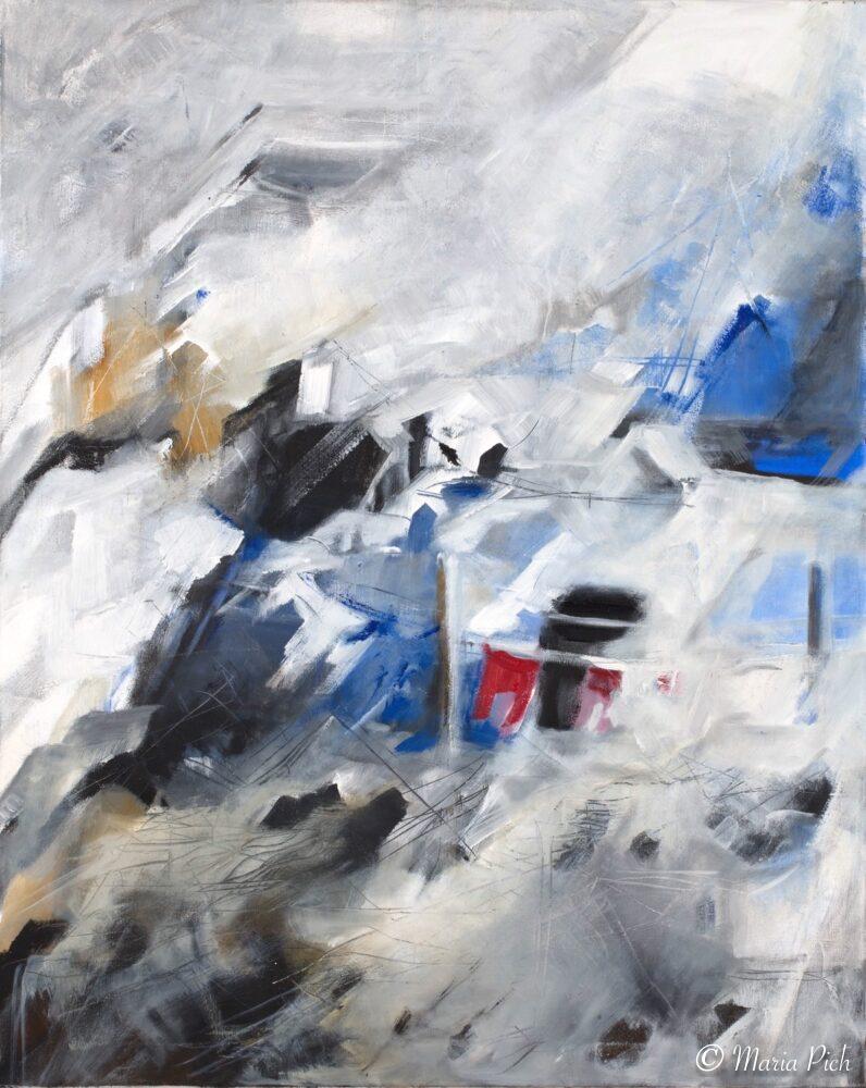 abstrakte Winterlandschaft im Sturm: Reduktion auf Farbflächen und Dynamik ( Anmutung einer Bergstation ...ein rotes T-Shirt auf der Leine)