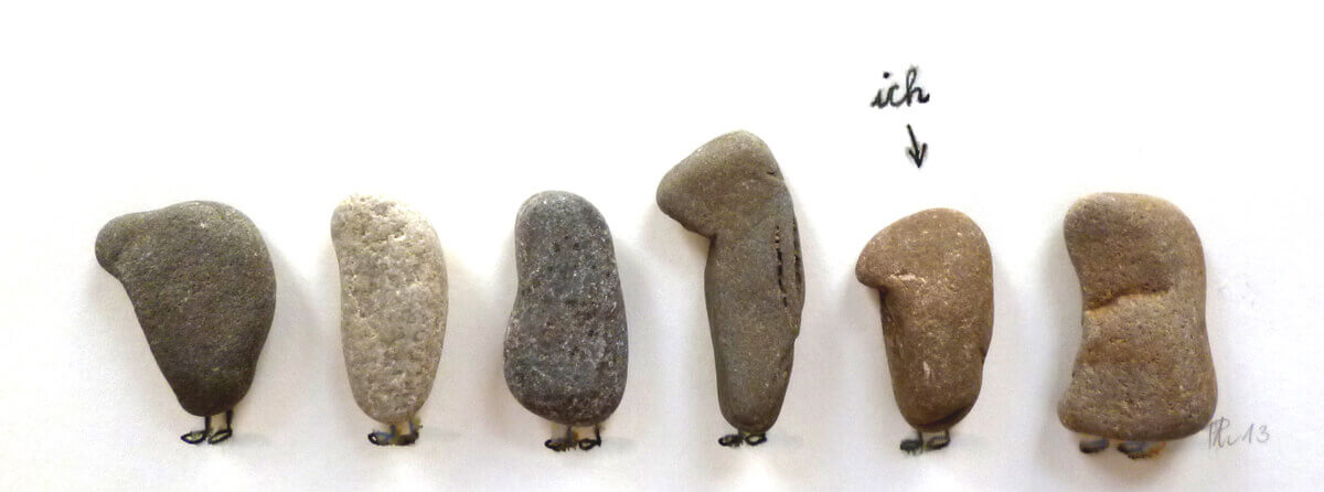 Die Kieselsteine sammelt Ulla Philipp übrigens bei Spaziergängen am Rhein. Dort liegen sie zu Millionen herum. Auf den ersten Blick sehen alle gleich aus, doch wer genau hinschaut, entdeckt die Unterschiede. Vielleicht ist das der Grund, warum sie sich so gut zur Darstellung von Menschen eignen.