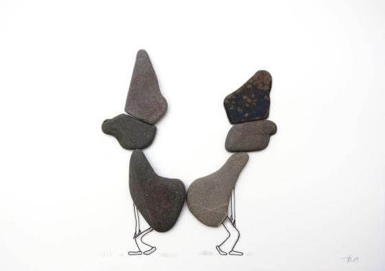 Gleichzeitig sind Philipps Stein-Collagen weitaus komplexer als die Summe ihrer einzelnen Teile vermuten lässt. Mit meist nur wenigen Tuschestrichen werden ihre Flusskiesel lebendig und lösen beim Betrachter Assoziationsketten aus, denen er sich nicht entziehen kann. Plötzlich werden in der Form des Steines ein Kopf, ein Körper, eine Parkbank oder ein Luftballon, denen zwei Gestalten hinterher schauen, sichtbar. Das Arrangement wird zur poetischen Ein-Bild-Geschichte oder zum absurd-ironischen Cartoon in der Tradition eines Friedrich Karl Waechter. Manchmal fügt Philipp auch Sprechblasen mit kurzen Sätzen und Kommentaren hinzu. Die alltäglichen Steine unterhalten sich über Alltägliches – über abstrakte Kunst, die Folgen von übermäßigem Alkoholkonsum oder Modetrends. Manchmal füttern sie auch einfach bloß die Tauben im Park. Das macht sie menschlich und liebenswert wie die Protagonisten bei Jean-Jacques Sempé.
