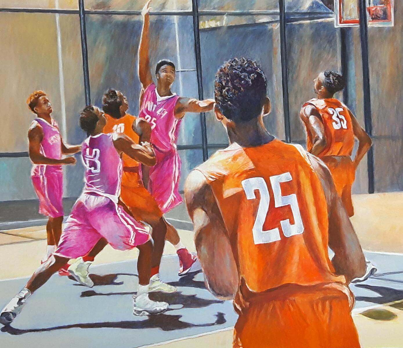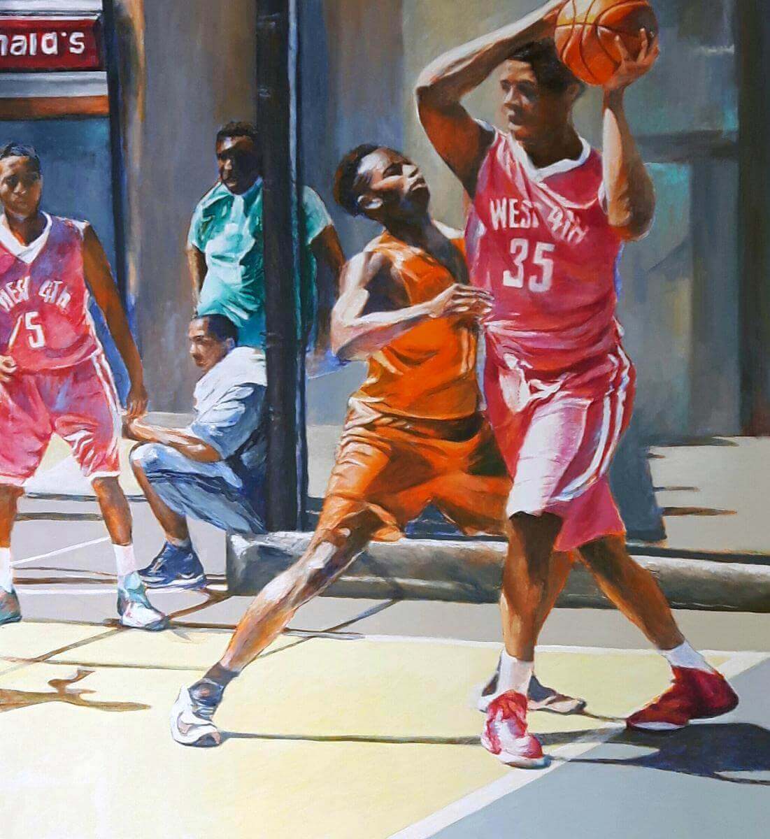 Einen Schwerpunkt dieser Ausstellung bilden Mo Kilders Gemälde aus der 2017 entstandenen Werkreihe „West 4th“. Gemeint sind die West 4th Street Courts in Greenwich Village, New York.„Die Inspiration für meine Bilder bekam ich dort bei einem zufällig beobachteten Street- Basketballspiel.“ Die unglaubliche Intensität und Dynamik des Spiels, die kraftvollen Bewegungen der Spieler in ihren grelleuchtenden Trikots, die von einem fast mystischen Licht erfasst wie Schauspieler auf einer Bühne wirkten, die gesamte Atmosphäre, die auch von den zahlreichen Zuschauern erzeugt wurde, zogen die Künstlerin in ihren Bann. „Mich hat diese Situation nicht mehr losgelassen. Später habe ich versucht, das Geschehen mit den Mitteln der Malerei wieder hervorzubringen.“