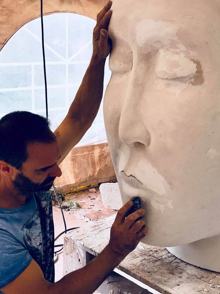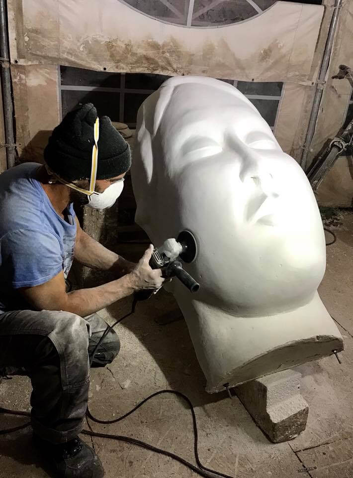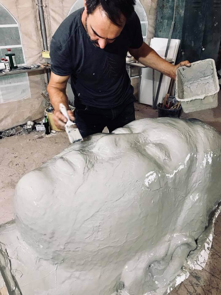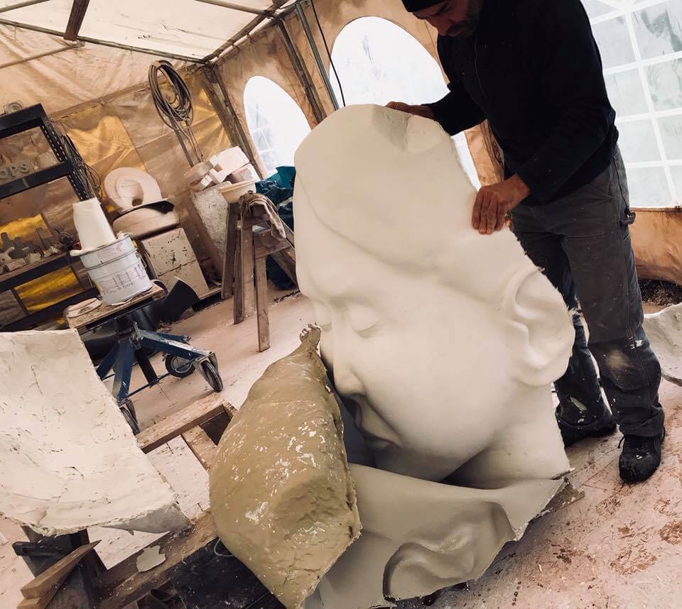 Hier wird der fertig modellierte Kopf mit einer Silikonschicht überzogen, so entsteht meine Negativform für den nächsten Schritt.