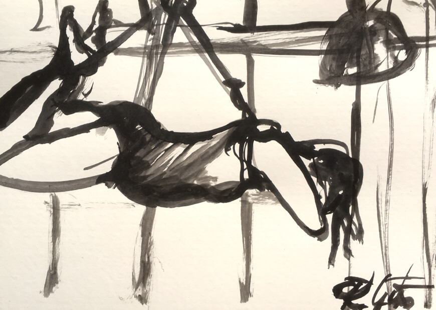 Von Grevy Kunstraum Grevy!, Grevy-Ausstellung With 0 KommentareShibari oder Kinbaku, die japanische Fesselkunst, die erstmals in der Edo Periode dokumentiert wurde, ist unter anderem seit einiger Zeit das Thema der Arbeiten von Renate Geiter. Dieses in seinen Formen, Knoten und Techniken hoch ausdifferenzierte Fesseln des menschlichen Körpers – ist es Kunst an sich schon? Ist es eine Form der Meditation? Ist es eine Performance oder ein Fetisch? Je nach Selbstverständnis der Ausführenden liegen die Schwerpunkte anders. Offensichtlich aber gelingt es Renate Geiter den ästhetischen Reiz von Körperhaltungen, Gliederverformungen, Knoten und Seilverstrebungen, sitzend, knieend, stehend oder sogar frei schwebend als künstlerischen Akt erfahrbar zu machen. Dabei bediente sie sich keiner Fotografien als Vorlage, sondern malte – überwiegend monochrom – live die beiden Protagonisten während ihrer Session. Im Prozess des Malens verlässt sich Geiter auf die Energie der Spontanität und führt den Pinsel durch die sich verändernden Zustände der Modelle. Der daraus resultierende Zeitmangel und die ständige Bewegung des Motivs bedingen dabei keinen Verlust an Konzentration und Genauigkeit, mehr noch steigert das unbewusste, rasche Arbeiten die Hinwendung auf das augenblickliche, sich dem Auge einprägende Moment. Geiter versucht die für sie entscheidenden Momente in reduzierter Form festzuhalten ohne Gegenständlichkeit zu verlieren. Nicht zufällig erinnern die verdünnte, schwarze Farbe und der rasche Pinselstrich dabei stilistisch an die japanische Tuschemalerei sumi-e. Das Ergebnis sind Arbeiten die es schaffen das Spiel zwischen dem Formen des Körpers durch die Fesselung und die sich daraus ergebenden Körperformen und Deformierungen als tief ästhetisches Erlebnis zu konzentrieren.