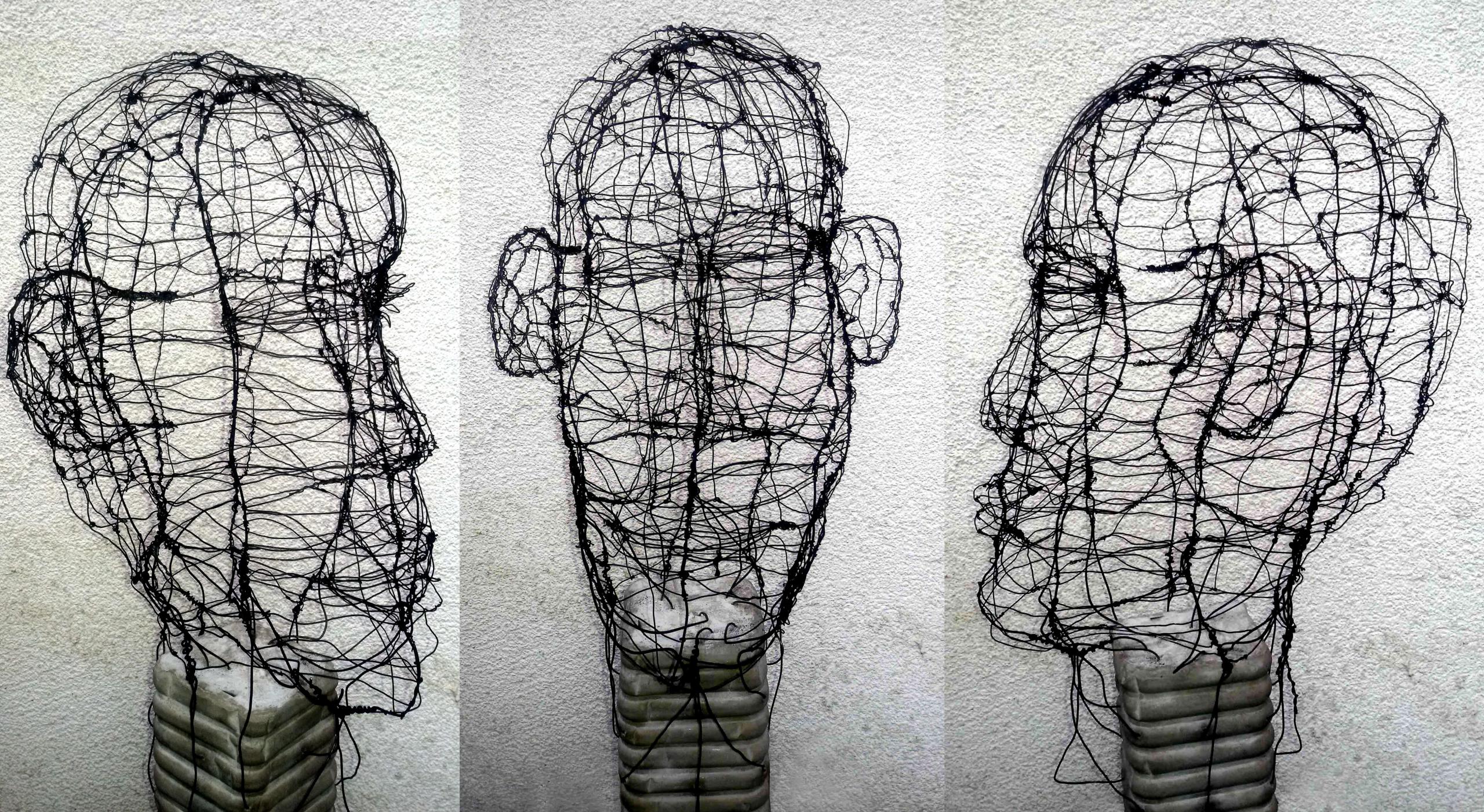 So machte ich den Anfang, indem ich zunächst erste Drähte in einen Betonsockel eingoss, so das erste Konturen des Kopfes zu erkennen waren. Dann suchte ich Freiwillige im Kurs, die gemeinsam mit mir den Kopf weiter aus Draht formten.