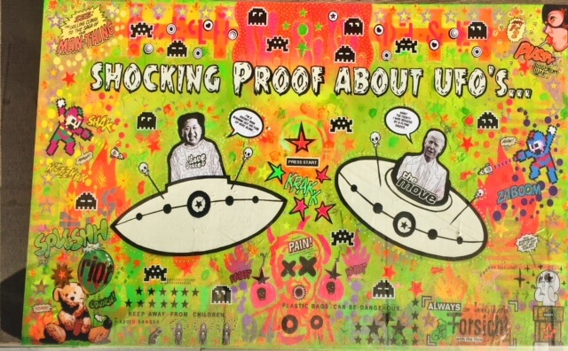 Was ihm der Streetart-Künstler „xxxhibition“ zwischen die Auslagen gestellt hatte, waren nur vordergründig putzige Comic- und bunte Graffiti-Bilder: Dem japanischen Figürchen „Kitty“ hat eine Bombe den Kopf zerfetzt, der Peanuts-Snoopy hält auf dem Dach seiner wüst besprayten Hundehütte ein Nickerchen. Auch Schneewittchen ist dabei, sie posiert mit Darth Vaders Helm. Und der nordkoreanische und der US-amerikanische Präsident fliegen in Ufos durch ein Fantasy-Universum, in dem längst nicht alles so lustig ist, wie es auf den ersten Blick erscheint. „Das Bild mit der Erdogan-Karikatur haben wir auf Wunsch meiner Frau herausgenommen, wir wollen nicht riskieren, dass uns vielleicht jemand deshalb die Scheibe einwirft“, erklärte Siegenbruck.