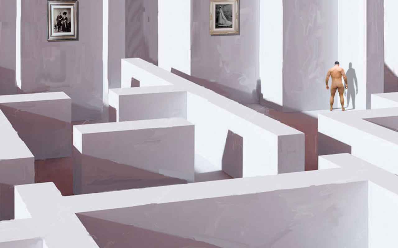 Norberto Luis Romero entführt in seinen Digital-Collagen in unheimlich weiße Labyrinthe oder beleuchtet ironisch-kritisch die (Schein-)“Heiligkeit von Weiß“ im klerikalen Kontext.
