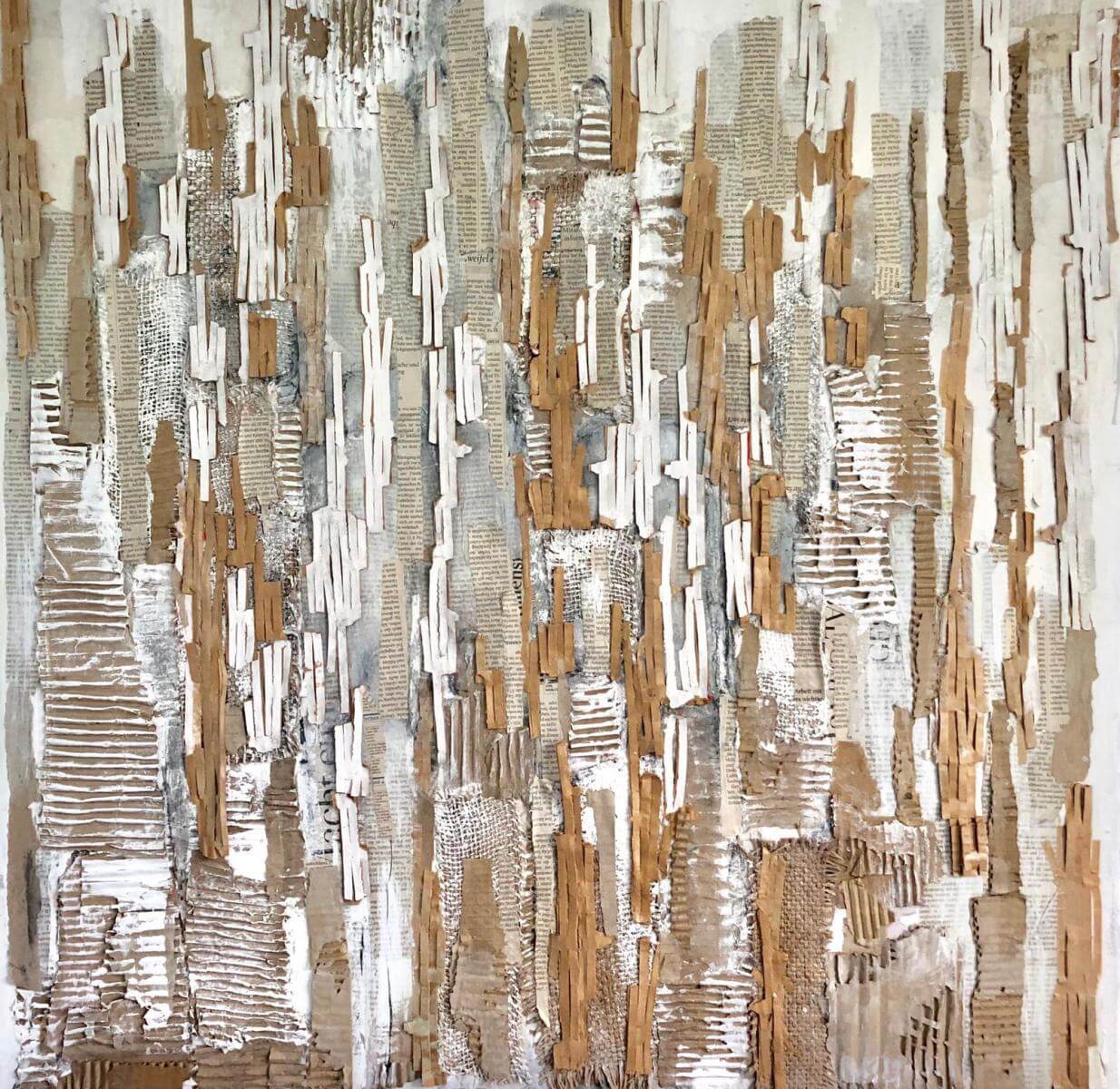 <p>Das Bild ist eine Collage auf Leinwand, gestaltet mit Wellpappe Zeitungspapier, Sackleinen, Ölfarbe und Gesso.</p>
