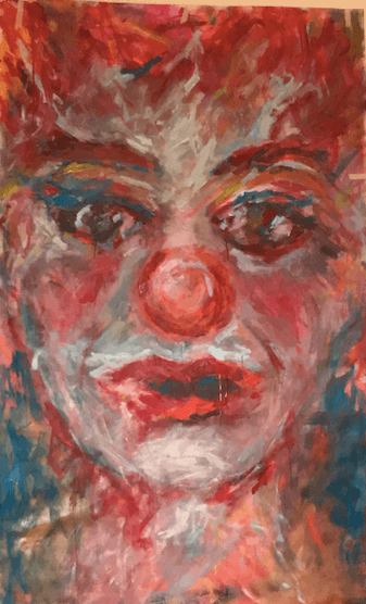 Maskierungen spielt. Die Aquarelle zeigen Portraits mit Clownsnasen,