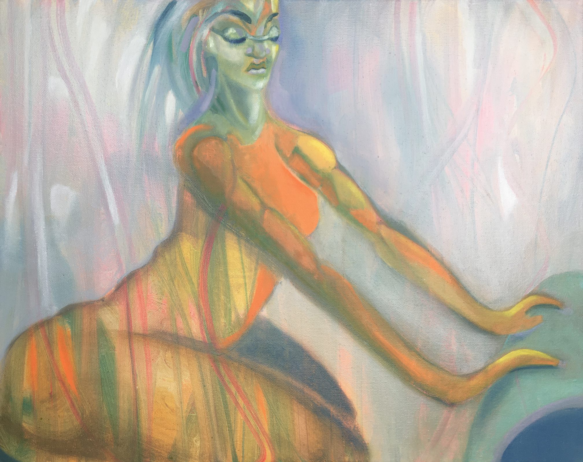weibliches Fantasiewesen sitzt in angespannter Haltung in sphärischer Umgebung
