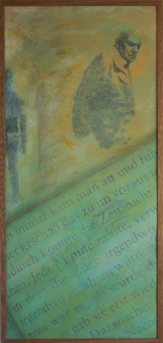 Acrylfarben-Druck-Mischtechnik auf Papier im Eichen-Holzrahme, Textfragmente aus „Das Wüten der ganzen Welt“ von Maarten t’Hart