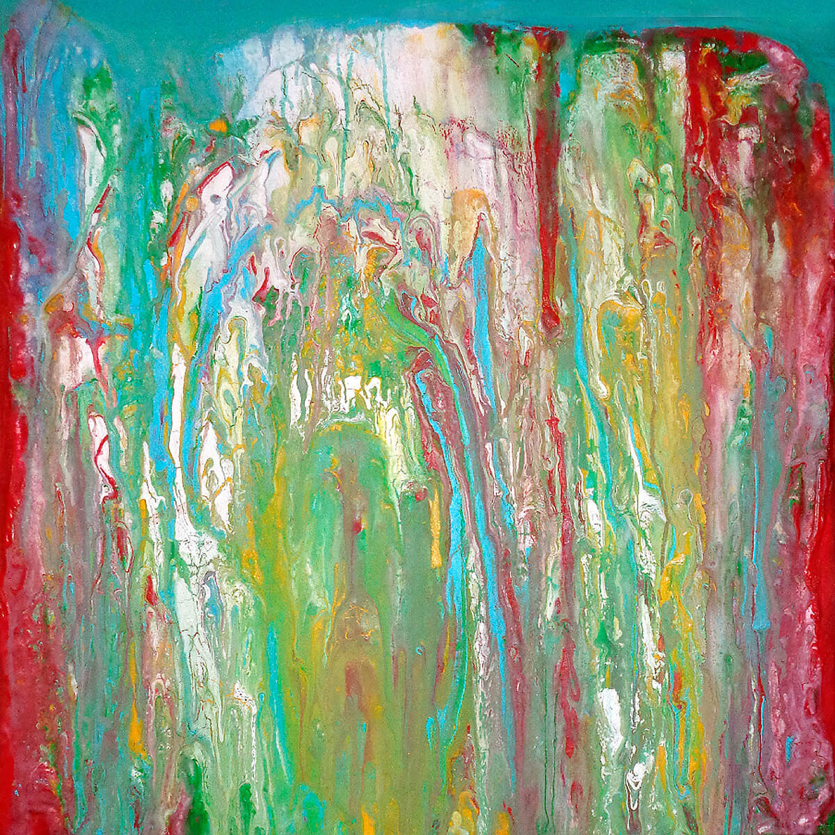"Colourful Flow" (Acryl auf Leinwand) ist Teil einer Serie von Farbverlaufsbildern. Dieses Werk entstand aus einem Gefühl heraus, die Farben sehr pastös aufzutragen, intensiv zu wässern, um sie dann anschließend durch Wenden und Schwenken der Leinwand ineinander fließen zu lassen.