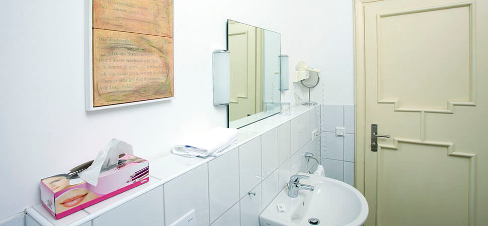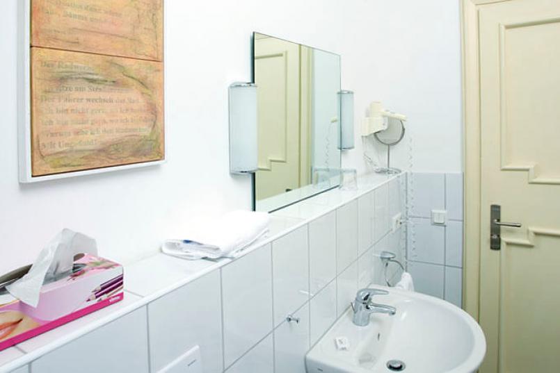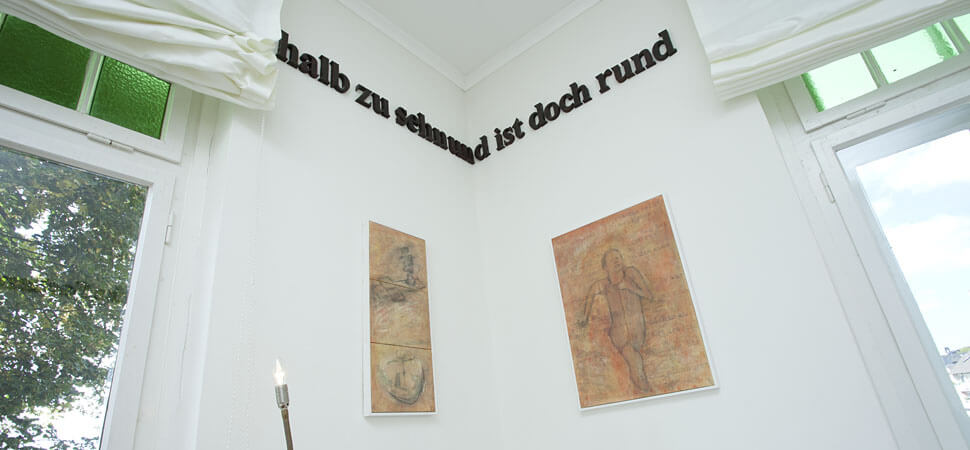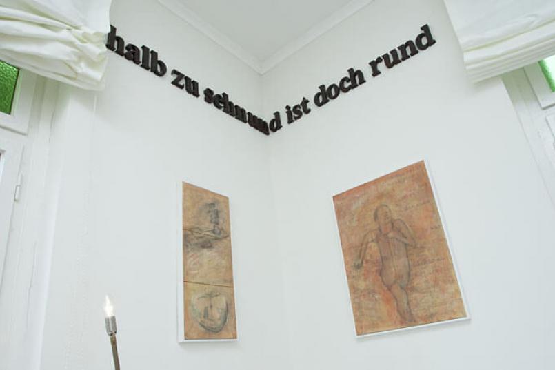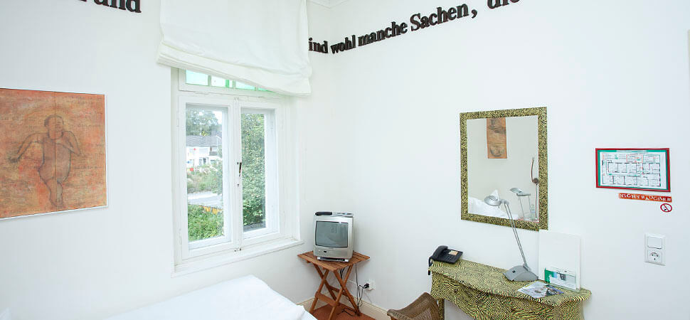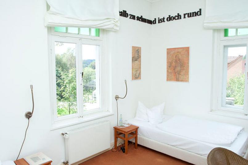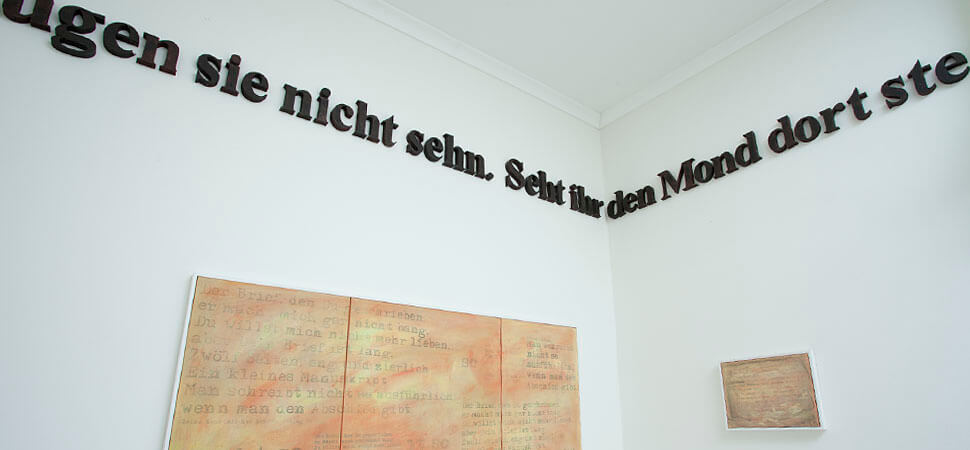 Im Jahr 2003 eröffnete in Lindlar im bergischen Land das Landarthotel der “artgenossen” mit Bistro und Veranstaltungsräumen. Die 13 Gästezimmer wurden von verschiedenen Künstlern aus Köln und dem bergischen Land gestaltet. Ich habe das “Mondzimmer” gestaltet. Meine Gestaltungen umfassen Bilder, Objekte und Möbel. Um die Themen Reisen, Weggehen, Abschied, Suchen, und Ankommen drehen sich die Texte, die ich in verschiedenen Bildern verarbeitet habe. Für den Schriftenfries - der auch dem Zimmer den Namen gab - habe ich die 3. Strophe des Abendliedes von Matthias Claudius gewählt