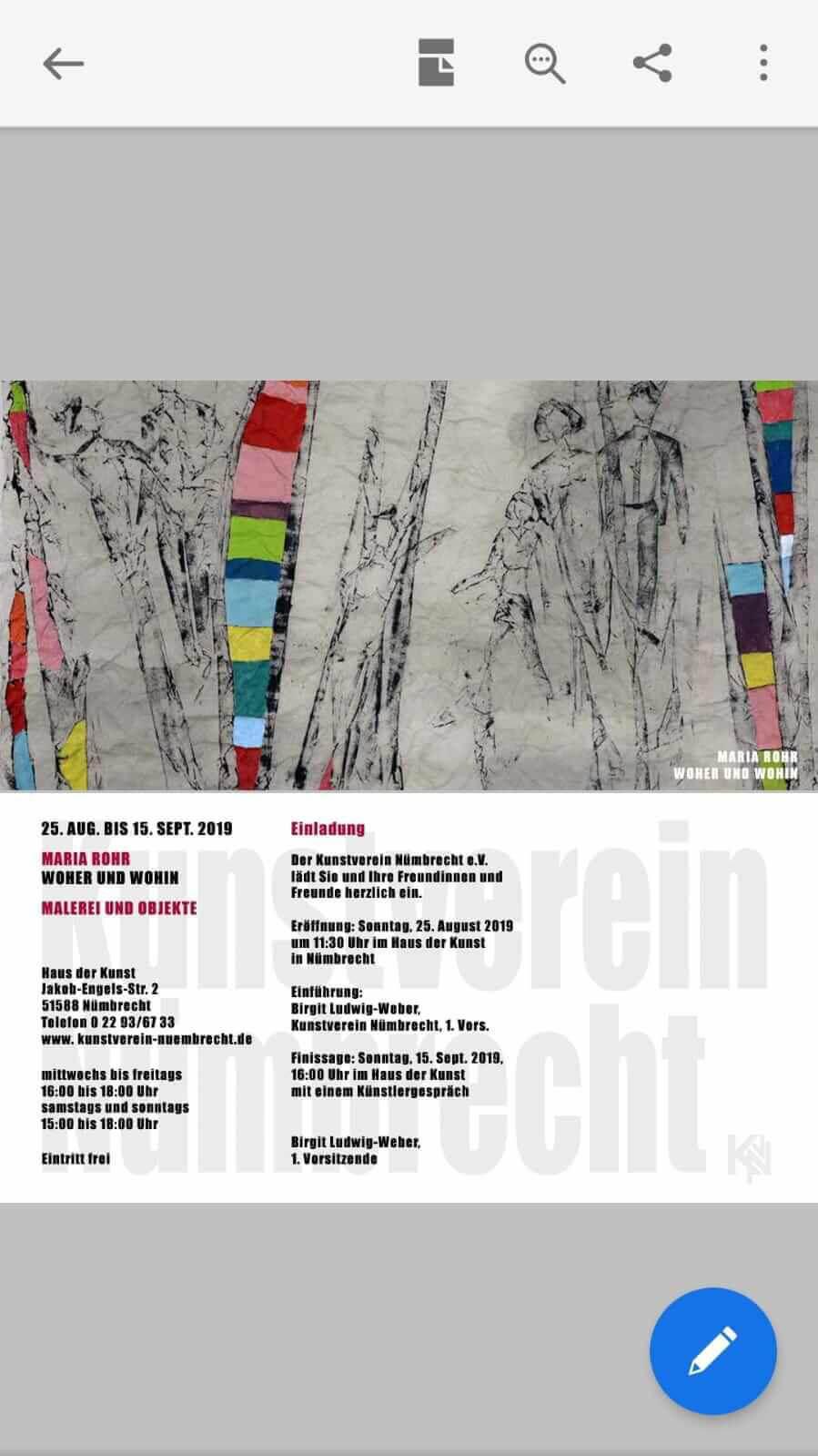 06 Aug WOHER UND WOHIN Von Maria Rohr With 0 Kommentare Ausstellung im Kunstverein NümbrechtDer Kunstverein Nümbrecht zeigt, beginnend mit einer Vernissage am Sonntag, dem 25. weiterlesen